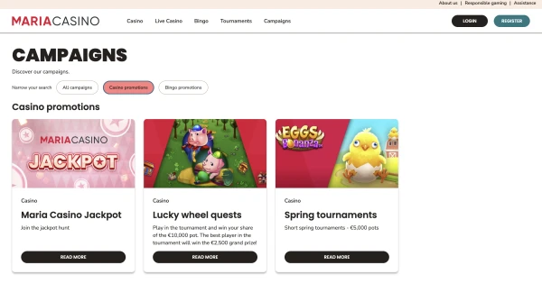 I tillegg til velkomsttilbudet tilbyr vi cashback og fellesskapsaktiviteter for casino- og bingospillere. Cashback beregnes ut fra nettotap og utbetales etter en fast ukentlig plan, mens turneringer rangerer spillere etter resultater basert pĂ„ oppgitt format. casino Maria stĂžtter ogsĂ„ âVerv en vennâ-belĂžnninger med en definert totalgrense, og bingospillere kan gĂ„ opp i nivĂ„ og bruke et belĂžnningshjul. Maria oppdaterer tilgjengeligheten av kampanjer, sĂ„ les alltid vilkĂ„rene som vises i kontoen din.